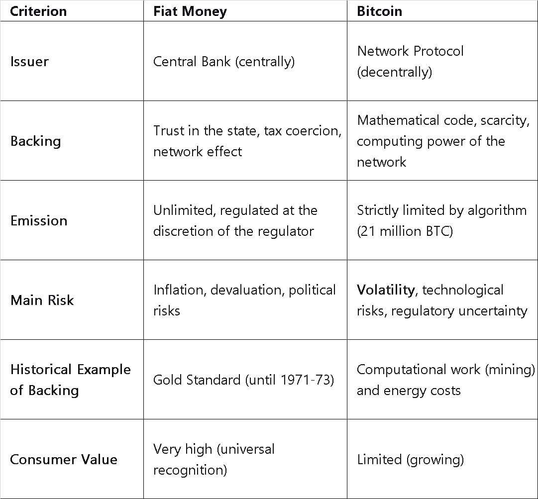 As can be seen from the table, both assets are in a sense “empty,” but the nature of this emptiness is fundamentally different. Fiat is a socio-political construct, the stability of which depends on the decisions of the authorities. Bitcoin is a technological and economic experiment, the stability of which (in the long term) is ensured by its immutable rules.